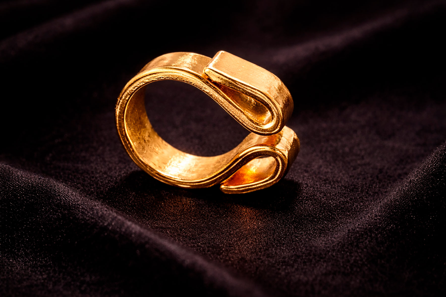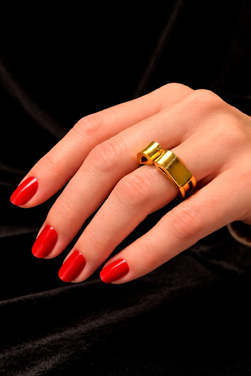 Su silueta fluida envuelve el dedo como un gesto protector, como si marcara el espacio íntimo donde nace lo esencial. Las curvas se pliegan sobre sí mismas creando tensión y equilibrio, materia y vacío, luz y sombra.