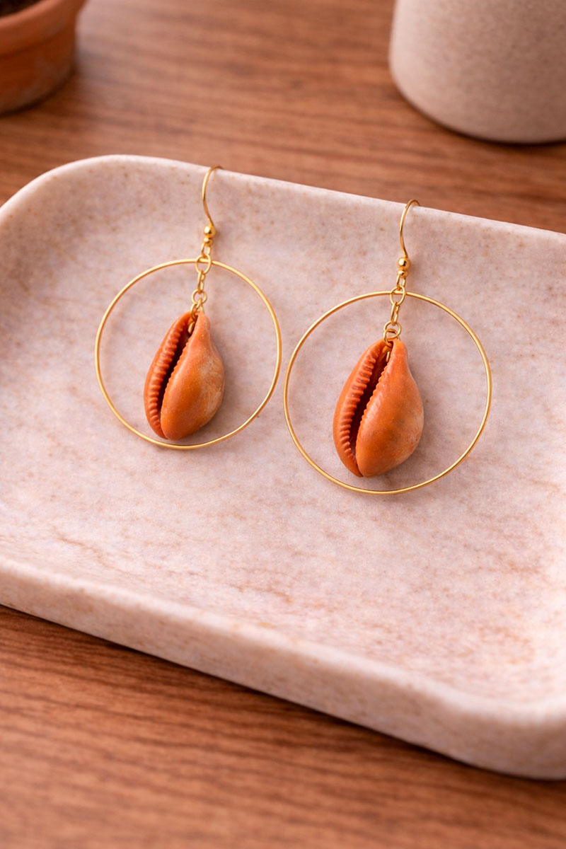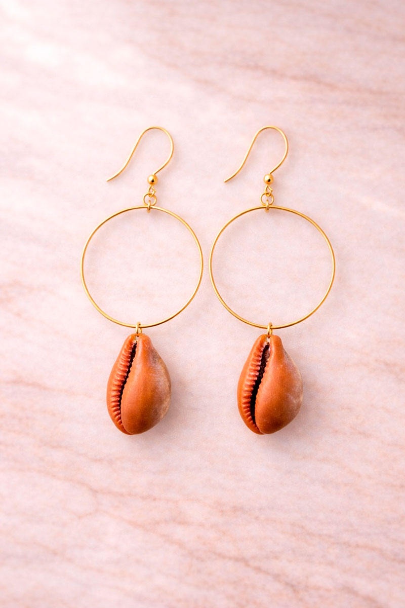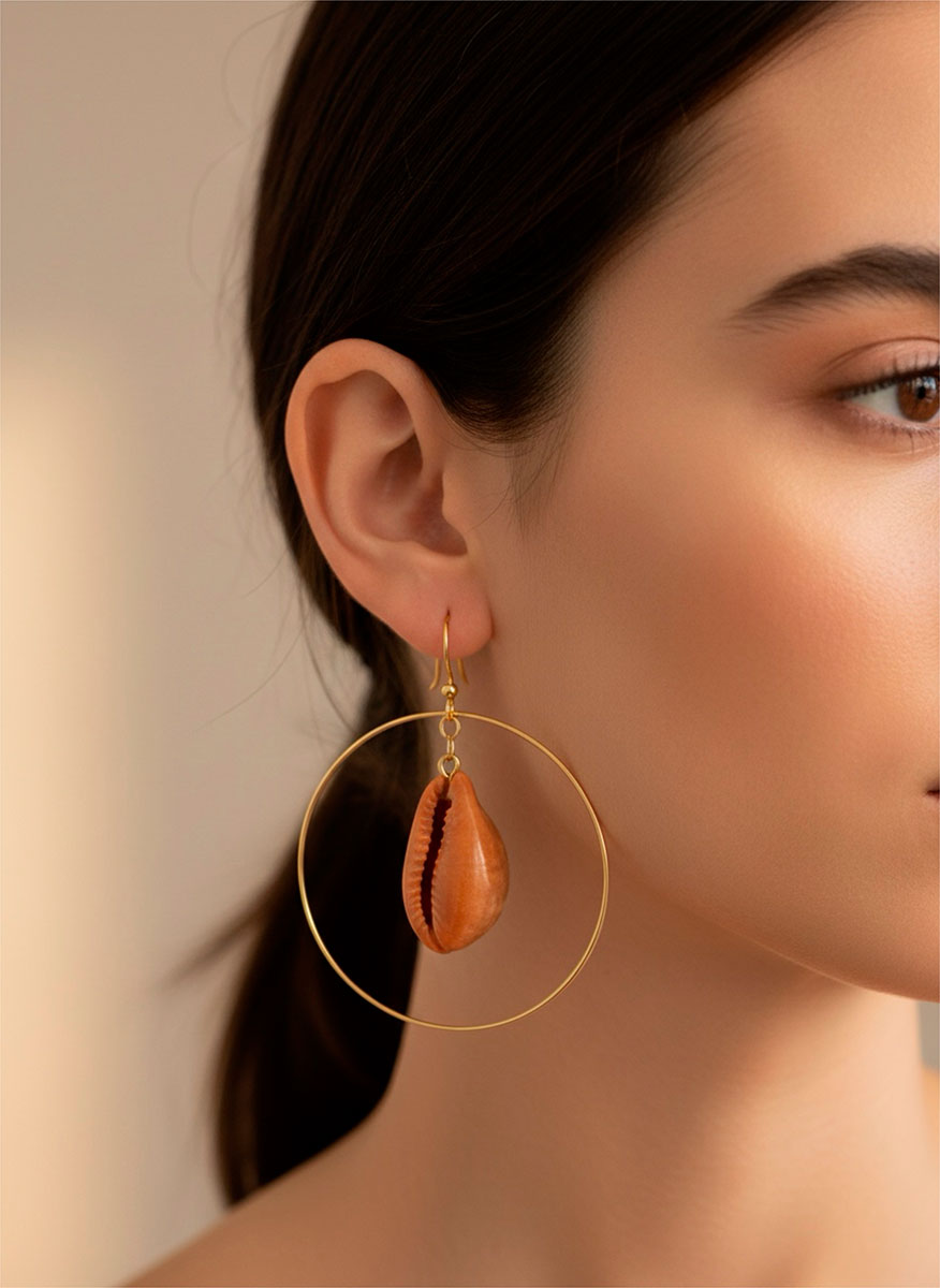 Fabricados a mano en latón, con un baño de oro, tiene una longitud de 7 cm. Los aros mide 5,5 cm de largo y las cochas que penden de ellos alcanzan los 3 cm. Son conchas naturales de las arenas tarifeñas, seleccionadas con mucho mimo y dedicación.