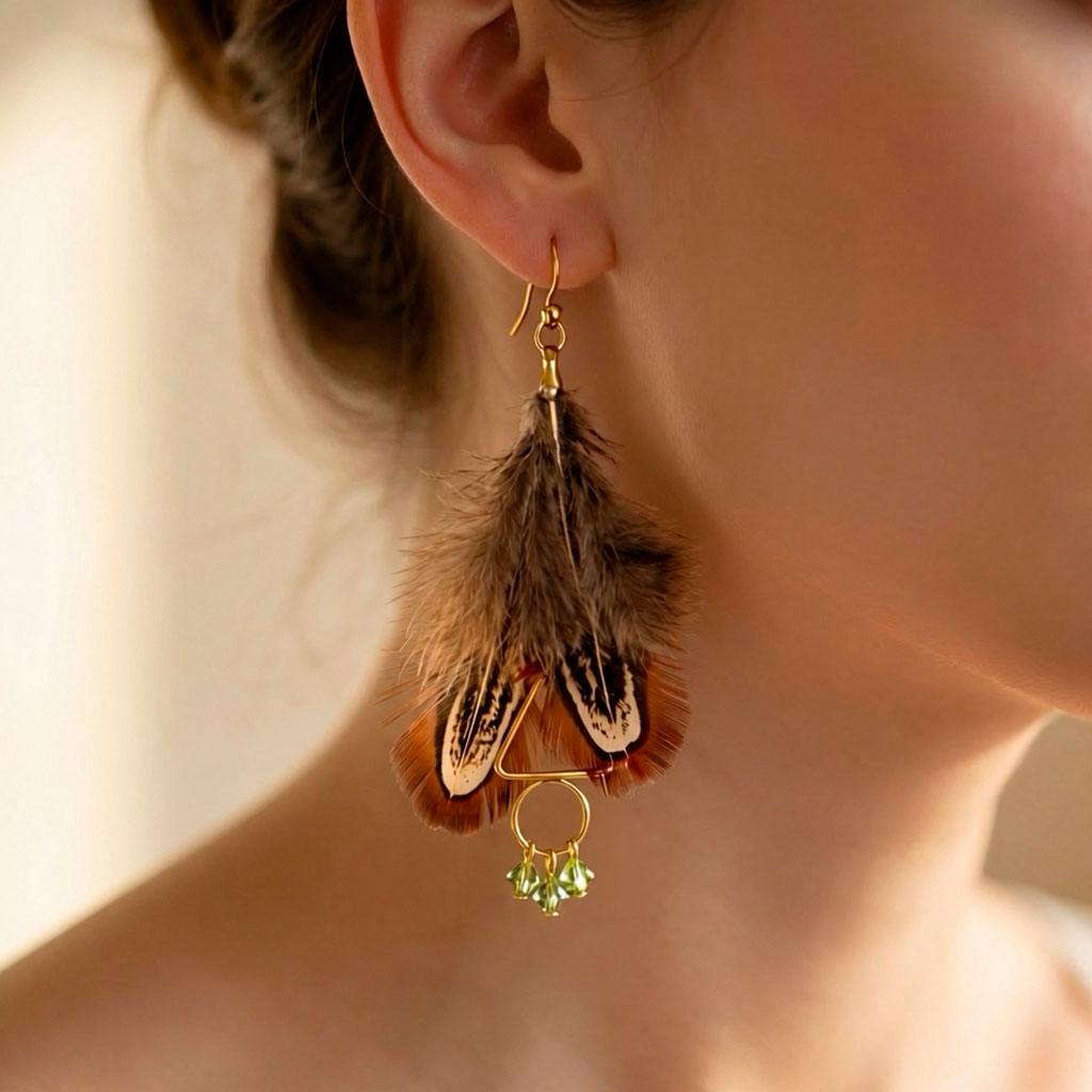 Realizados en bronce con plumas de pavo y cristales de Swarovski.