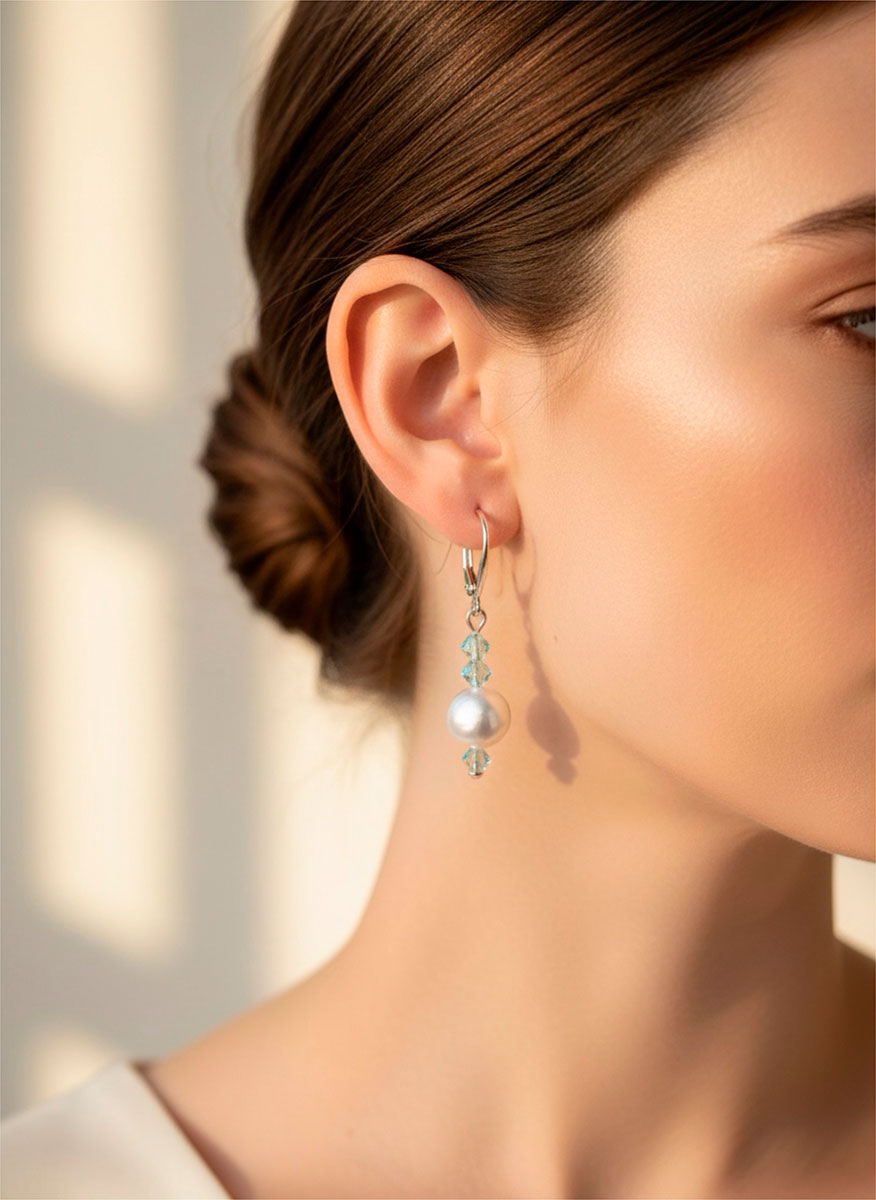 Las perlas que los conforman son una alusión directa a la belleza natural que hay en cada una de nosotras. Pero eso no es todo. Los cristales transparentes azulados de Swarovski que acompañan a las perlas aportan una dosis extra de luz al rostro que tiene el privilegio de llevarlos.
