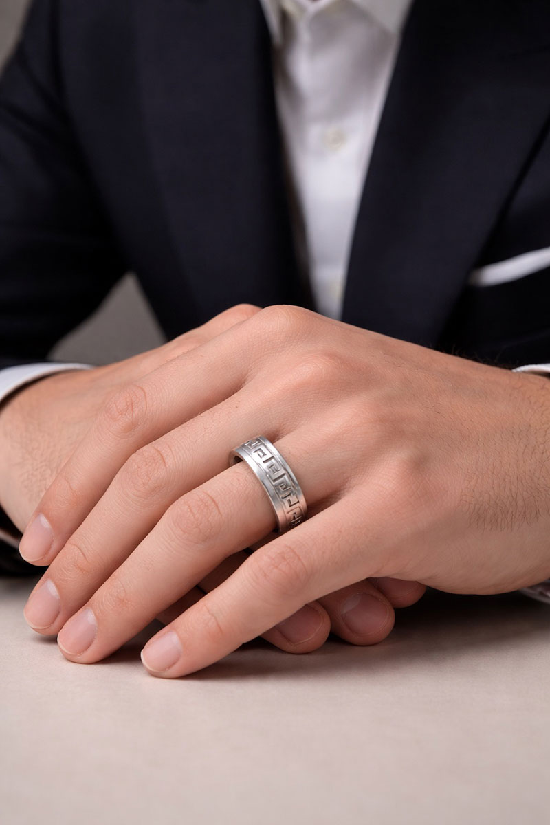 Su diseño geométrico en forma de cenefa hace que sea un anillo moderno y elegante, que combina a la perfección con un outfit de día, pero también con un con un look más discreto   de noche.